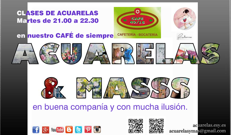 Desde hoy 18 de septiembre, los martes de 21.00 a 22.30, clases de acuarela, retomamos otro año mas en nuestro Café de siempre 40/15, con la agradable compañía de sus dueños, Adrián, Mariángeles y Fernando, os esperamos!!